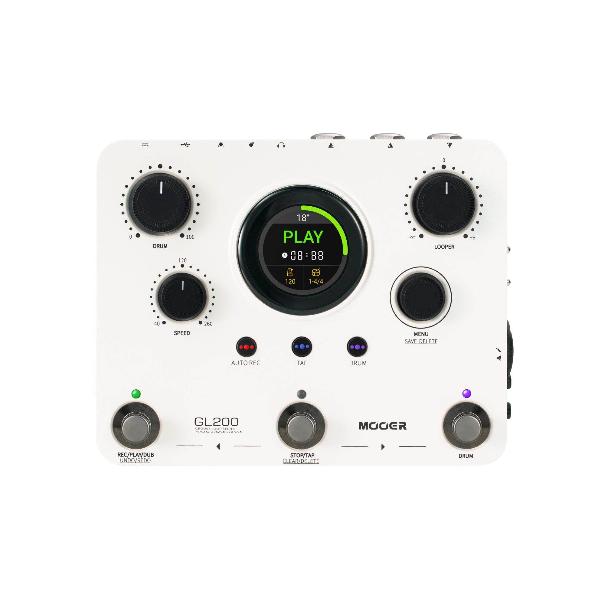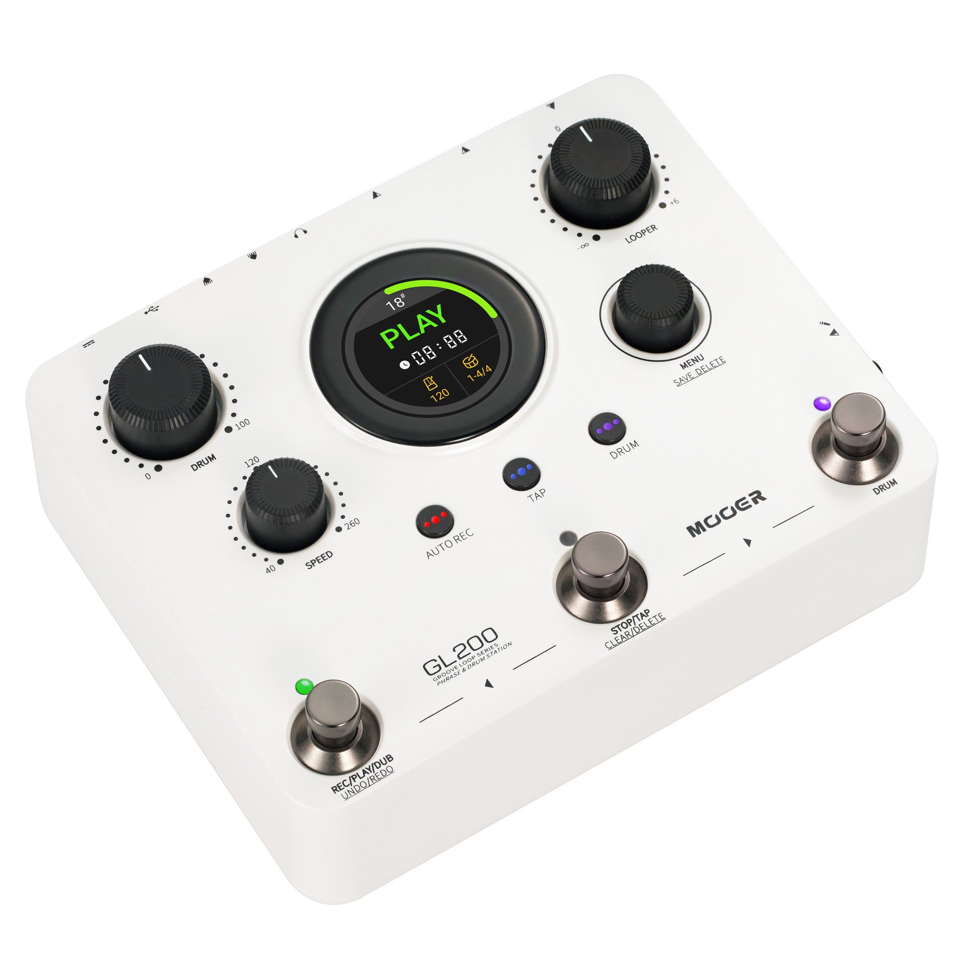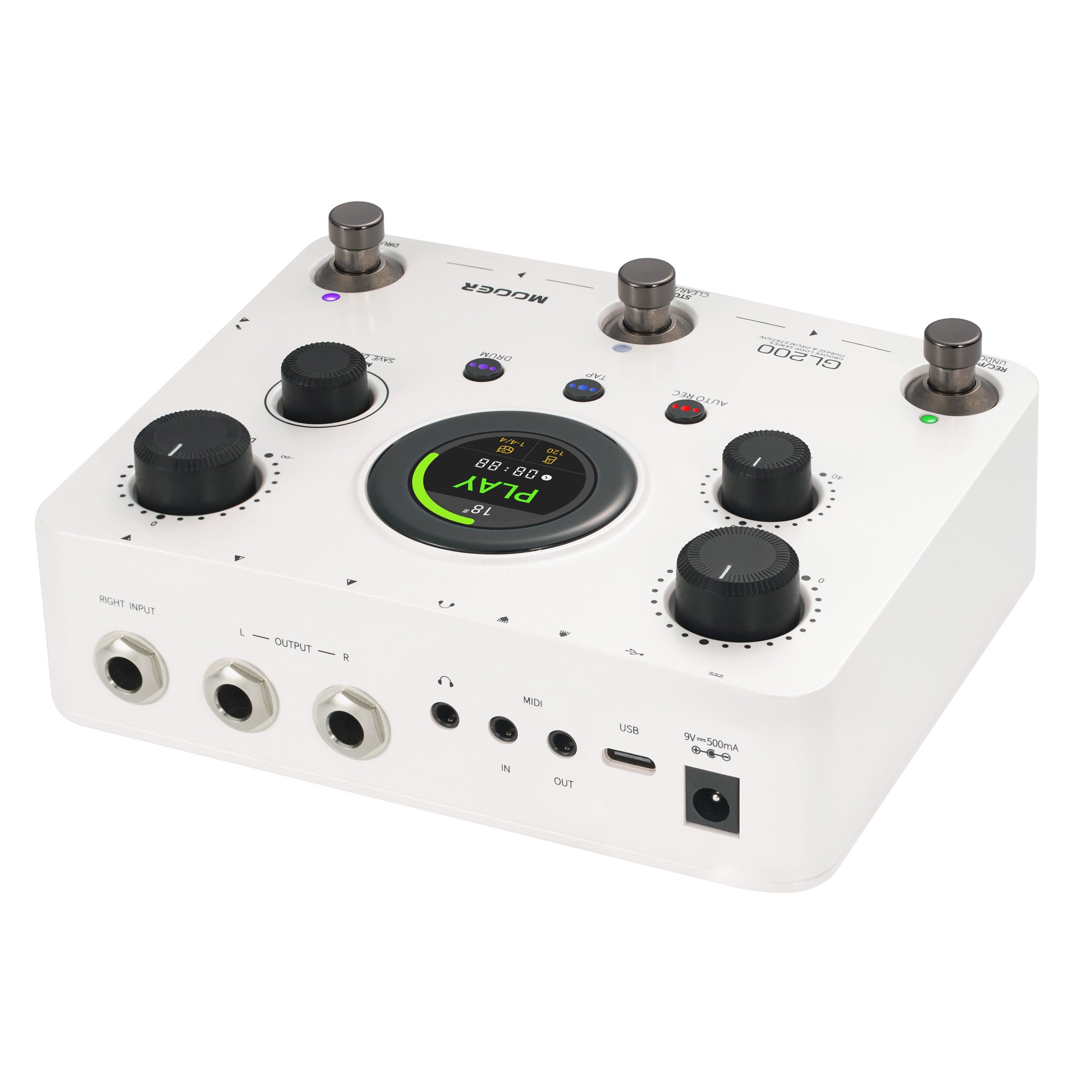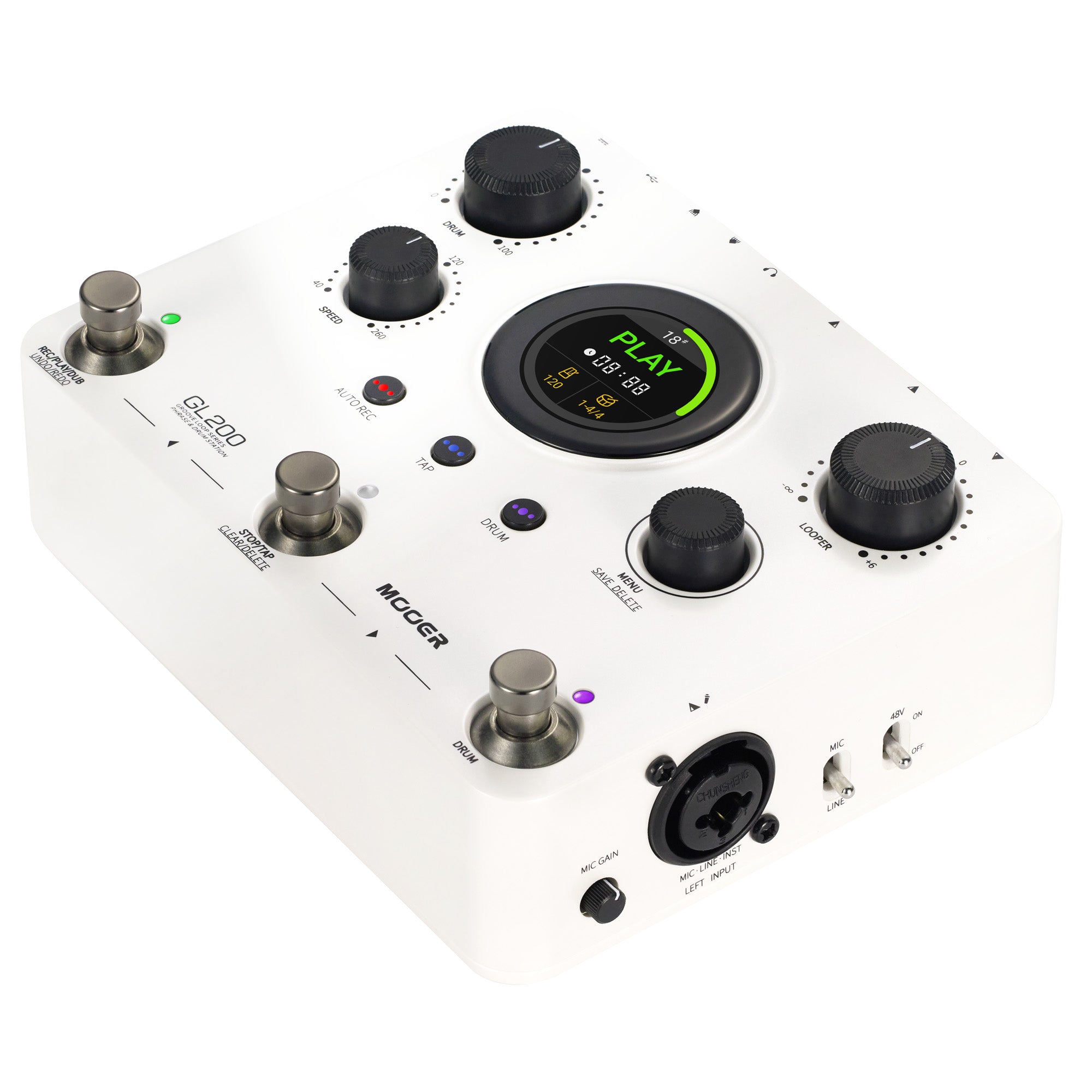 Pédale Mooer GL200, looper stéréo et boîte à rythmes, jusqu'à 300 minutes d'enregistrement, entrée combo XLR/Jack, MIDI, blanc